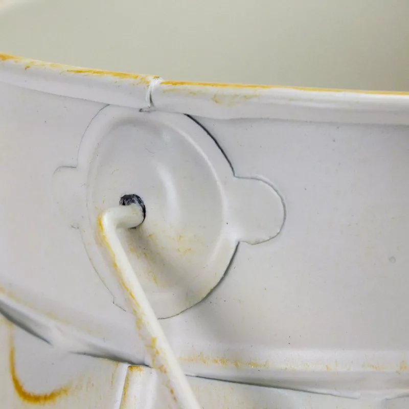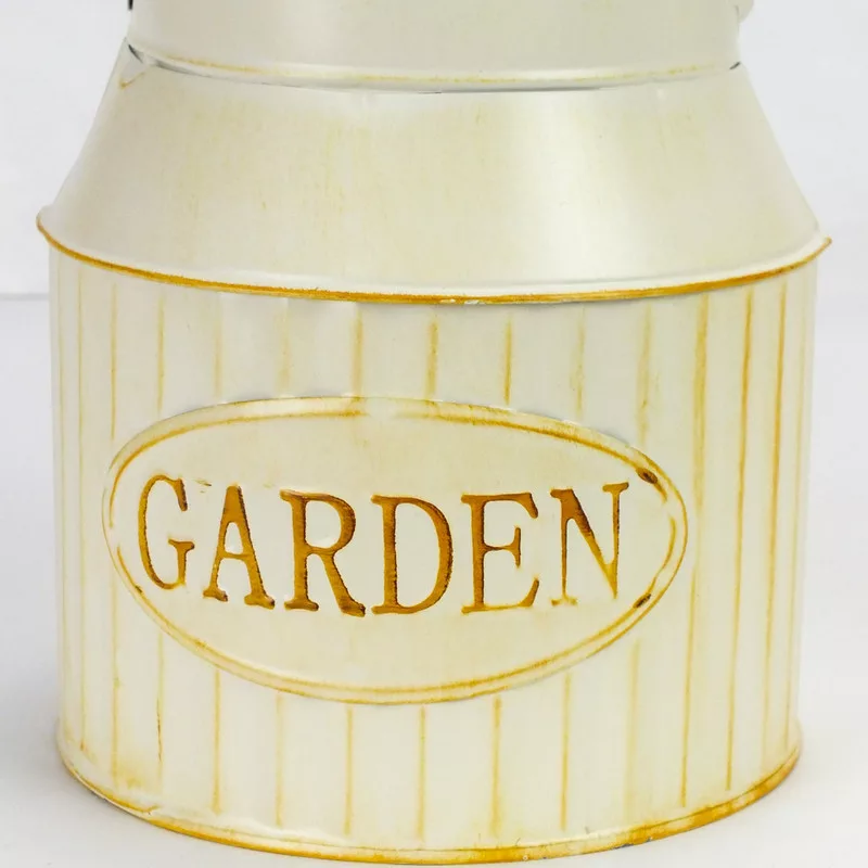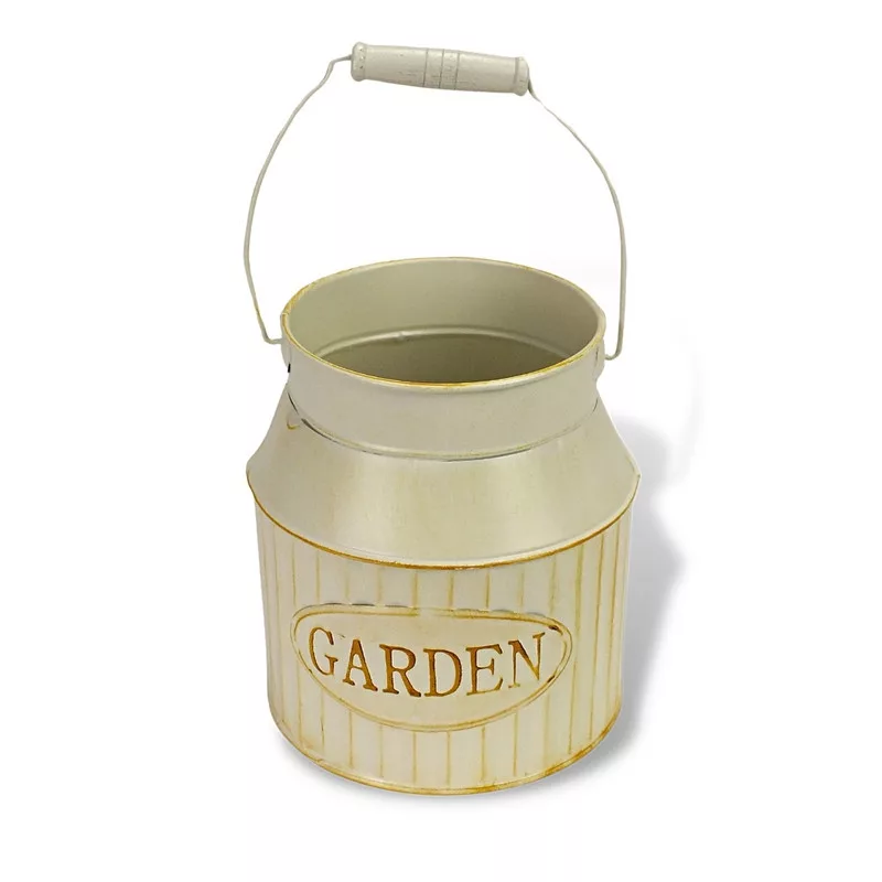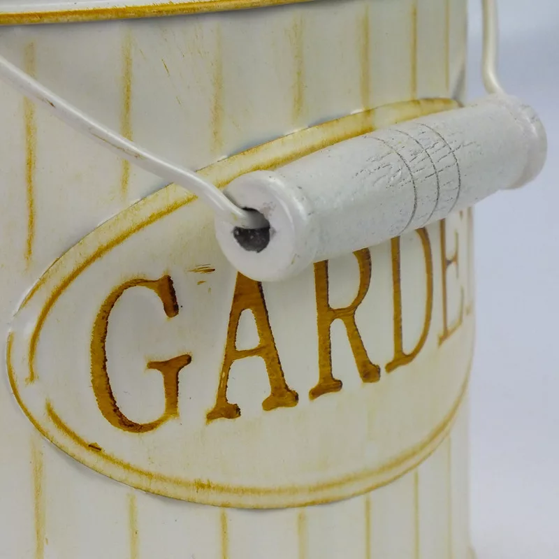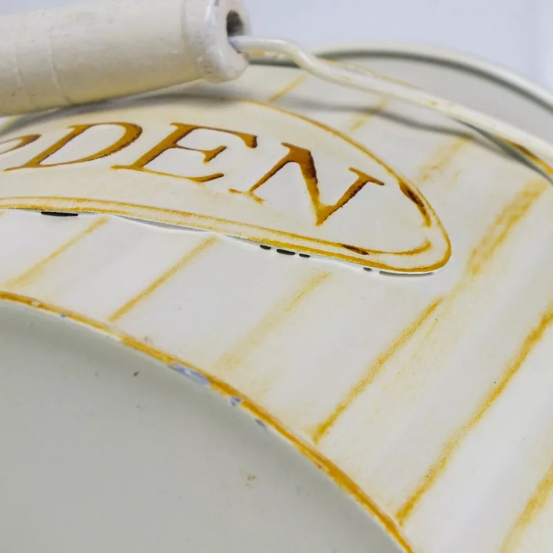 "Garden" feliratos bádog kaspó, fa fogantyús füllel.