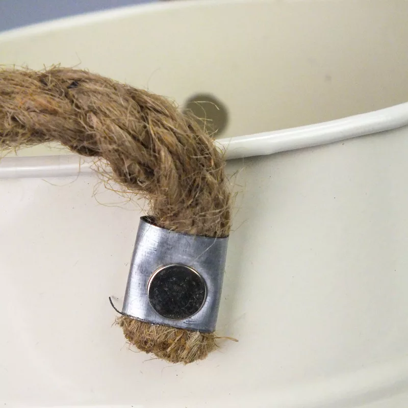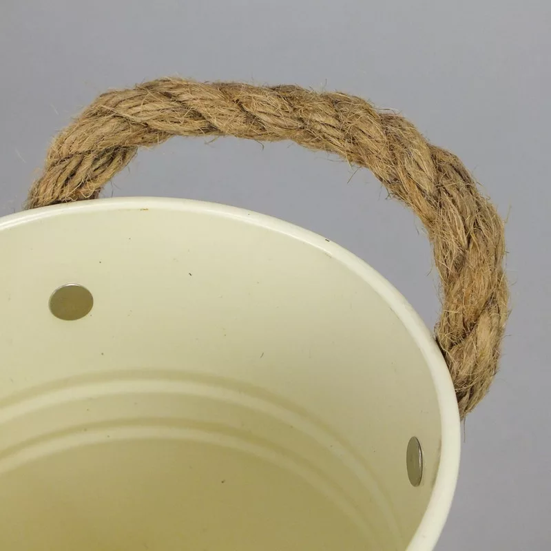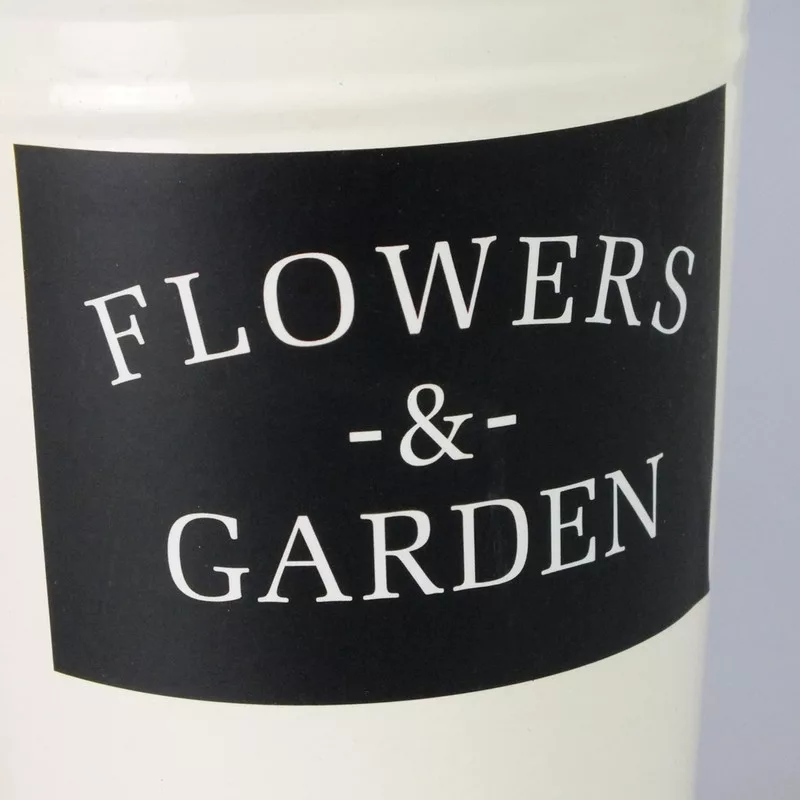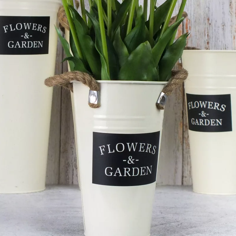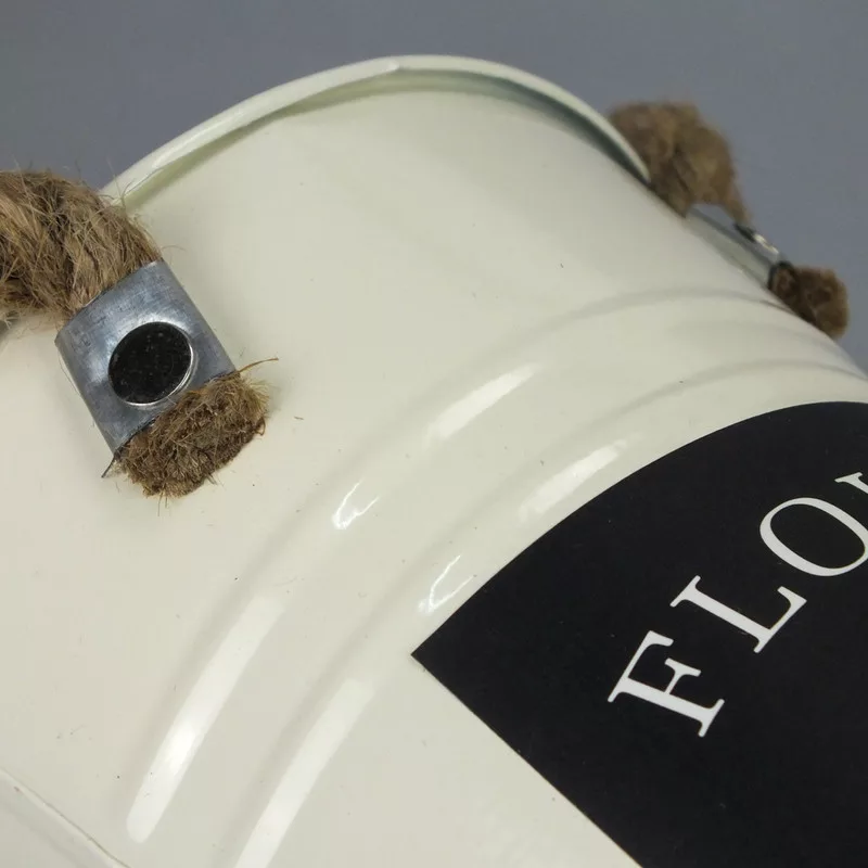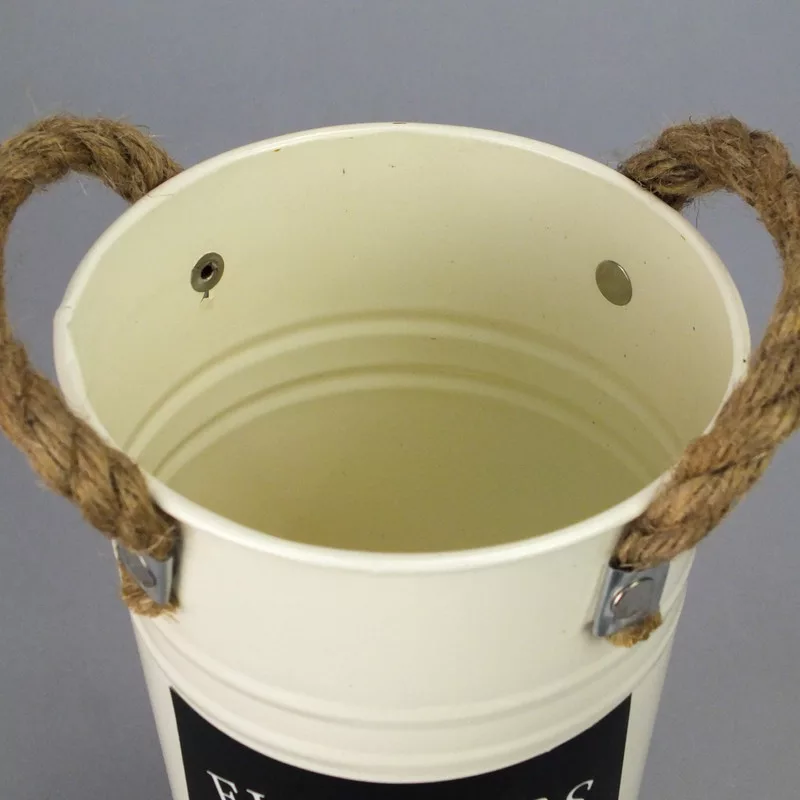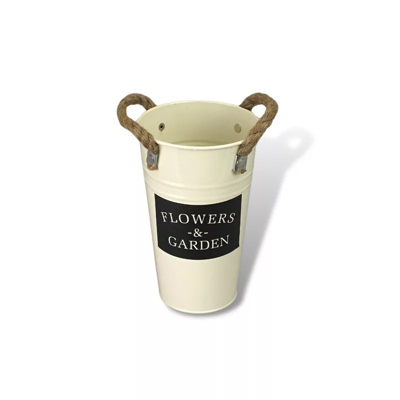 "Flowers & Garden" feliratos magasított bádog váza, kötél fülekkel.