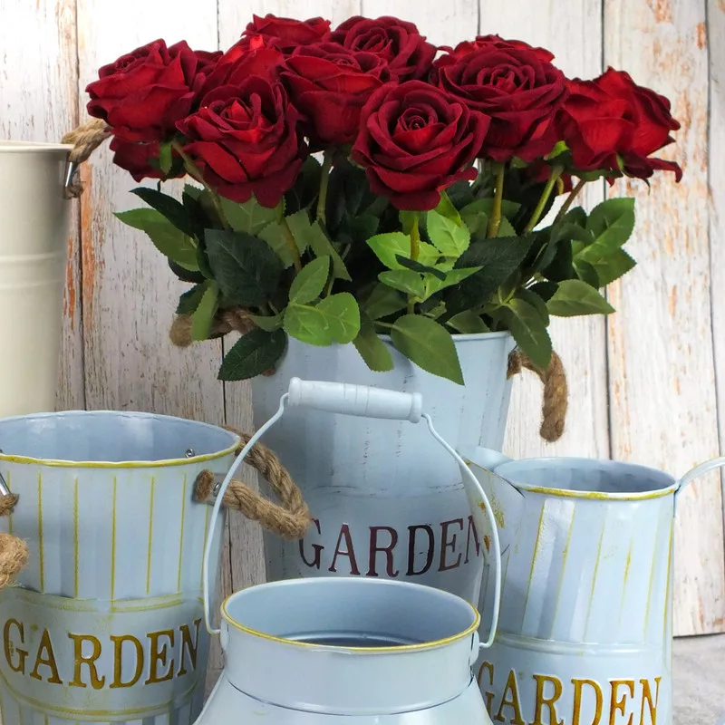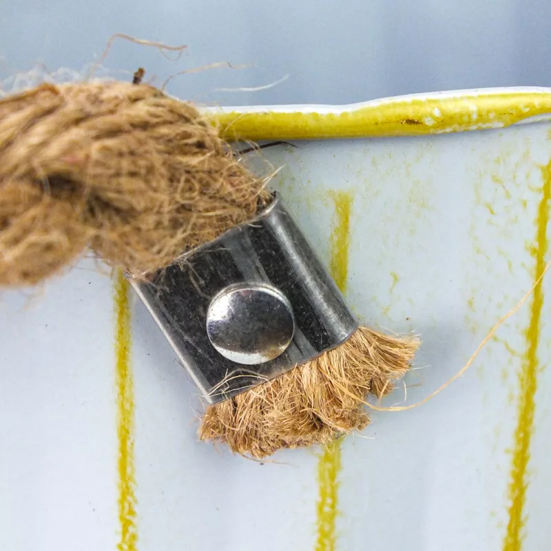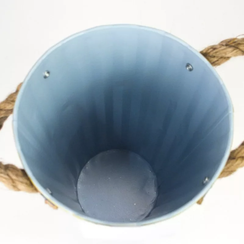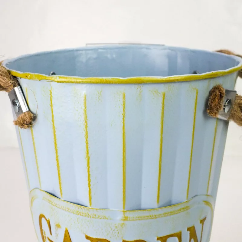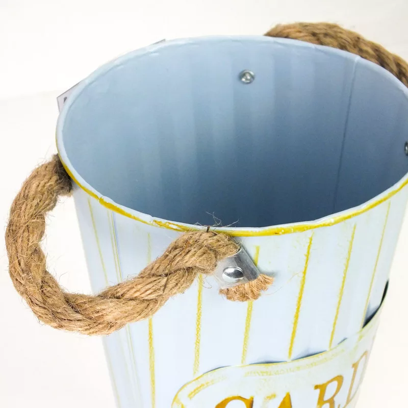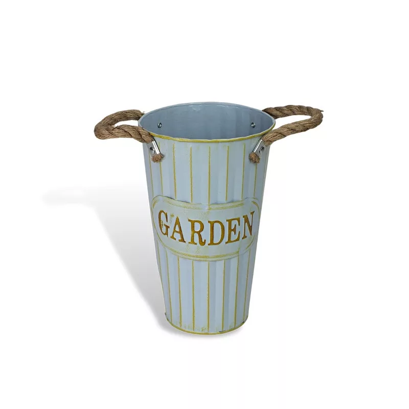 "Garden" feliratos magasított bádog váza, kötél fülekkel.