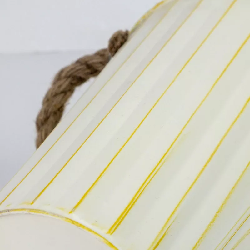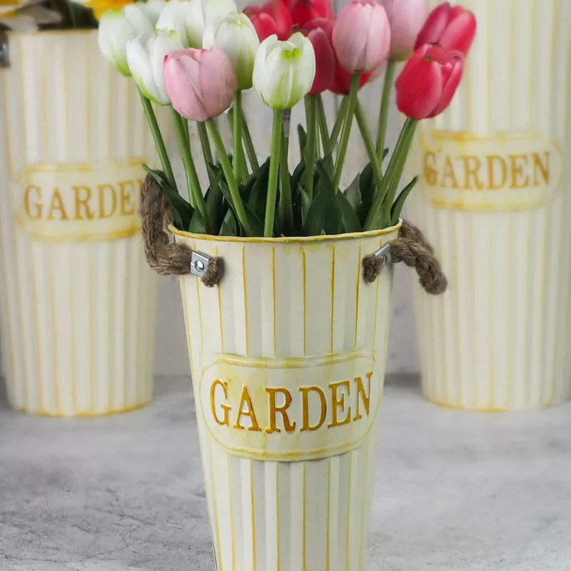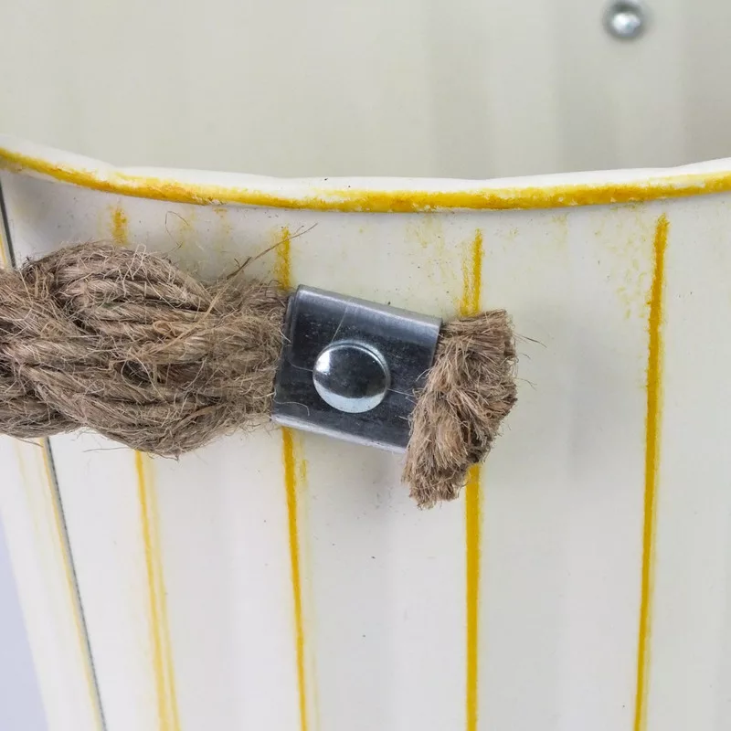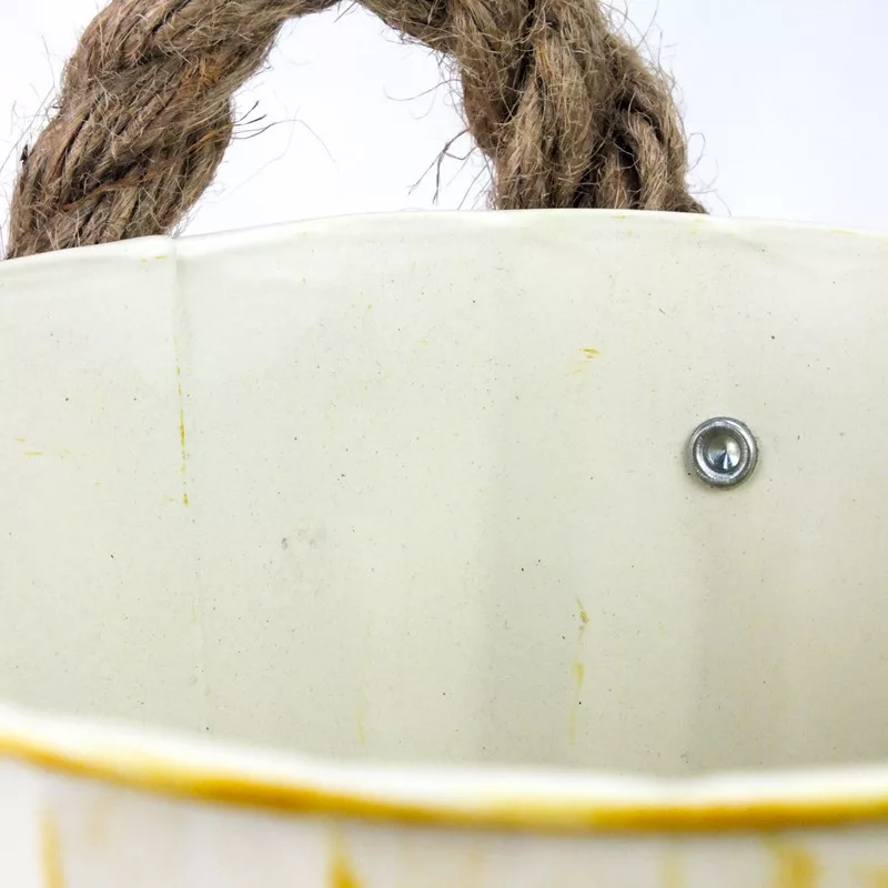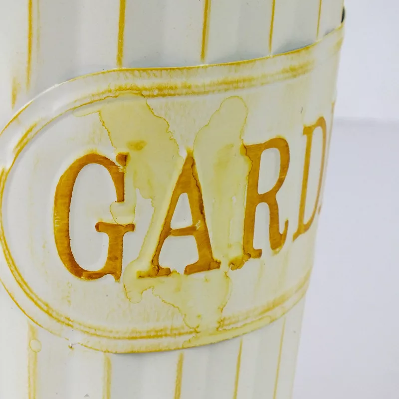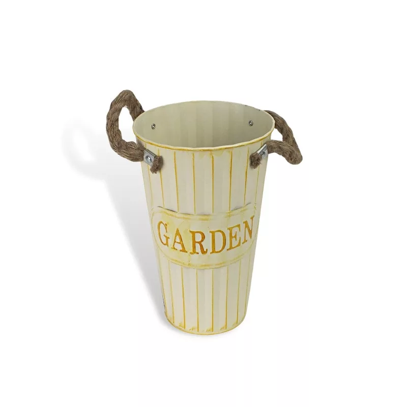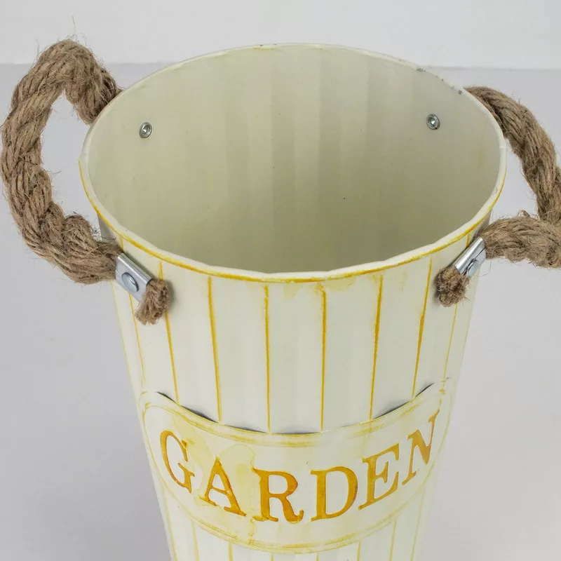 "Garden" feliratos magasított bádog váza, kötél fülekkel.