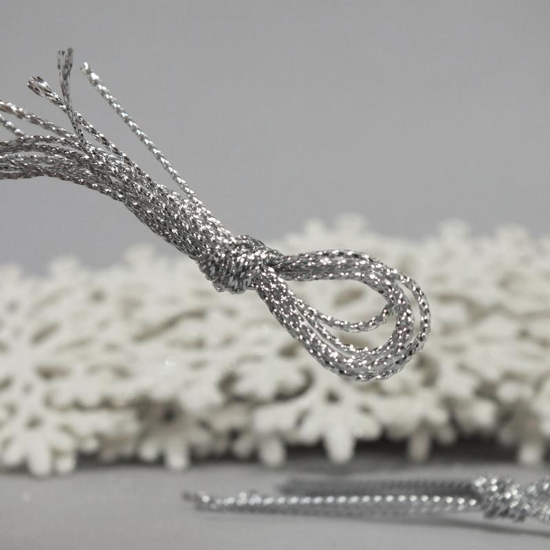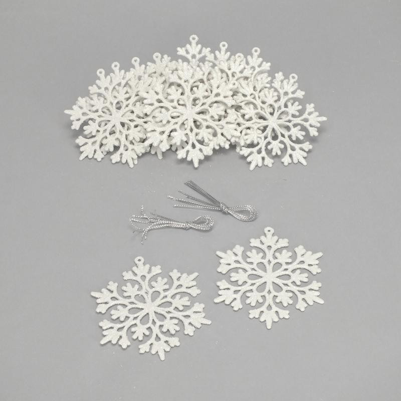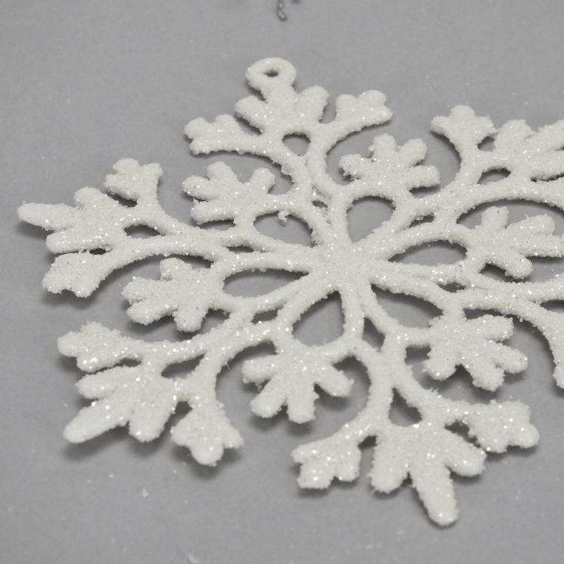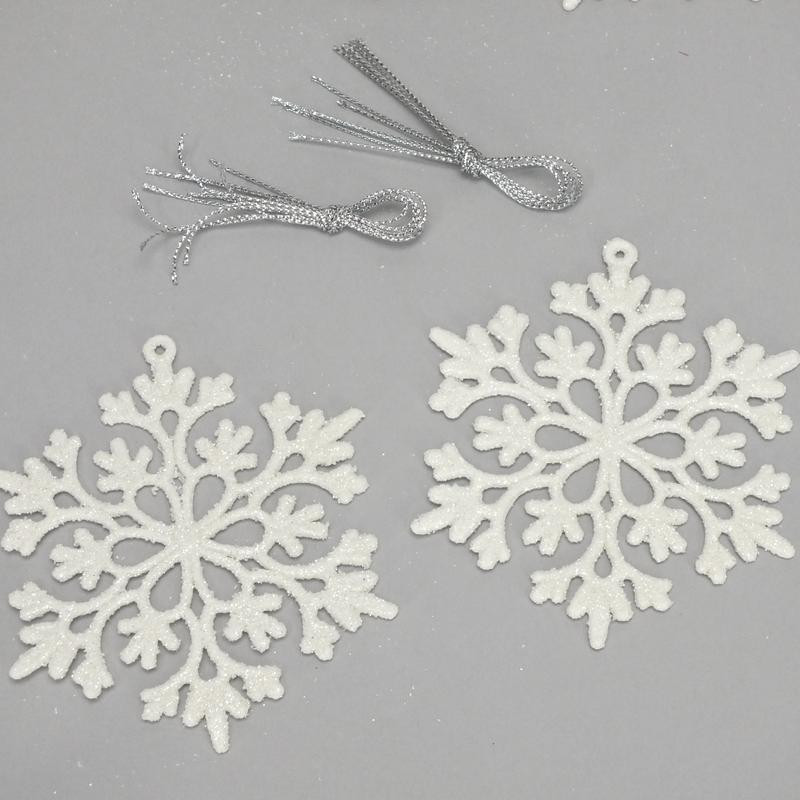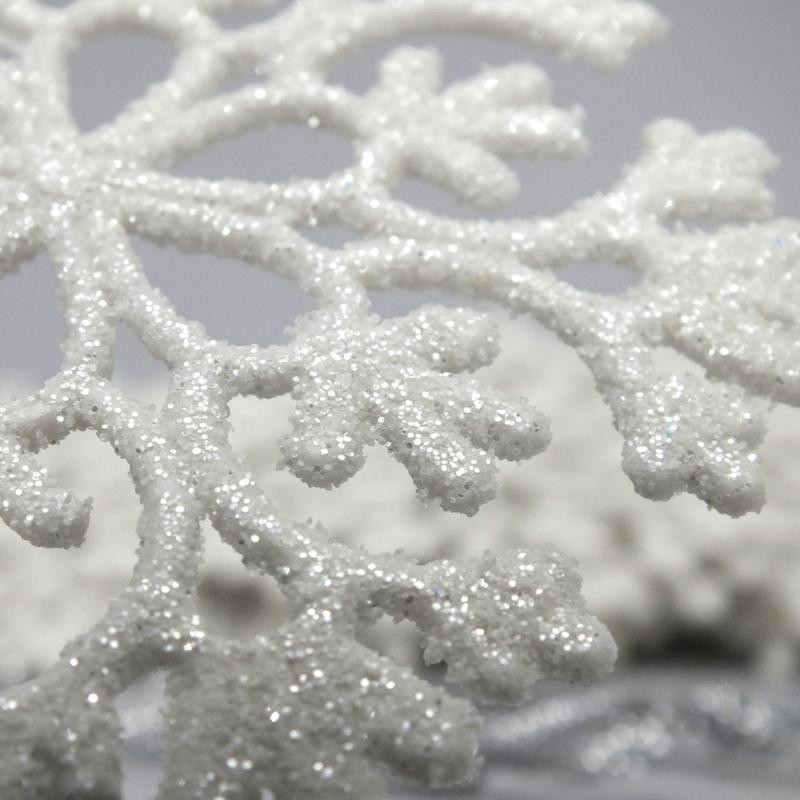 Csillámos felakasztható hópehely díszek, ezüst színű akasztóval.