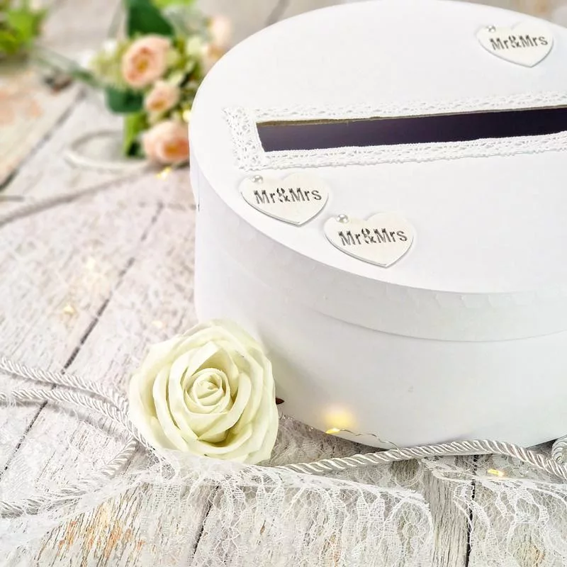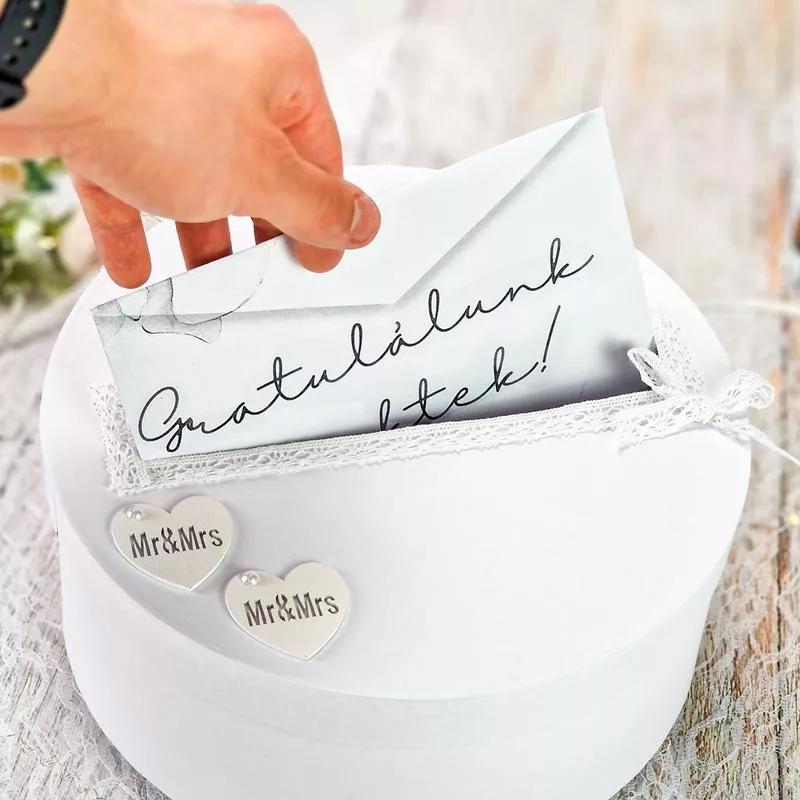 Fedezd fel a bájos papír dobozból készült esküvői perselyt, amely stílusos megoldást kínál a pénzgyűjtésre a nagy napodon! Ez a fehér színű persely tökéletesen illeszkedik az esküvői dekorációhoz, és egyedi, kreatív alkotóelemet képez. Ez a papírdobozból készült esküvői persely nemcsak praktikus, hanem emlékezetes ajándék is lehet az esküvőd résztvevői számára. Személyre szabhatod saját díszítéssel, névvel vagy dátummal, hogy még személyesebbé tedd.