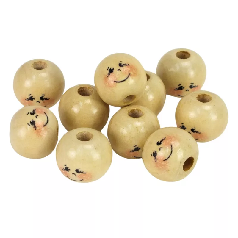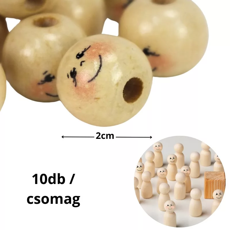 2 cm átmérőjű fagolyók, festett arccal. Akár felfűzéshez, akár bábukhoz vagy egyszerű díszítésekhez.