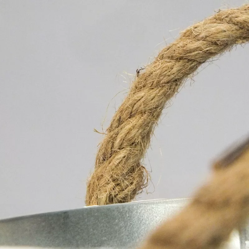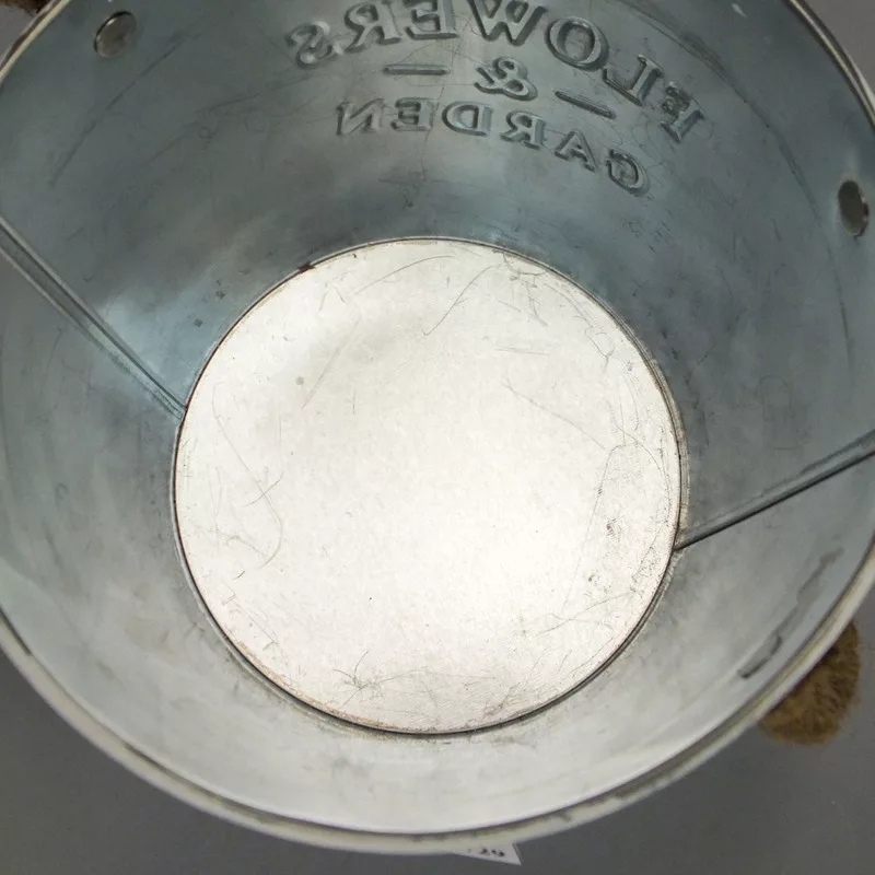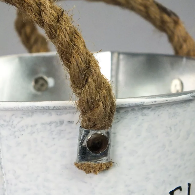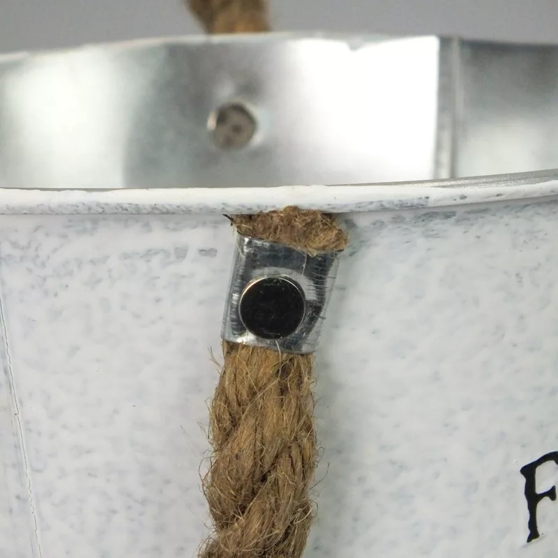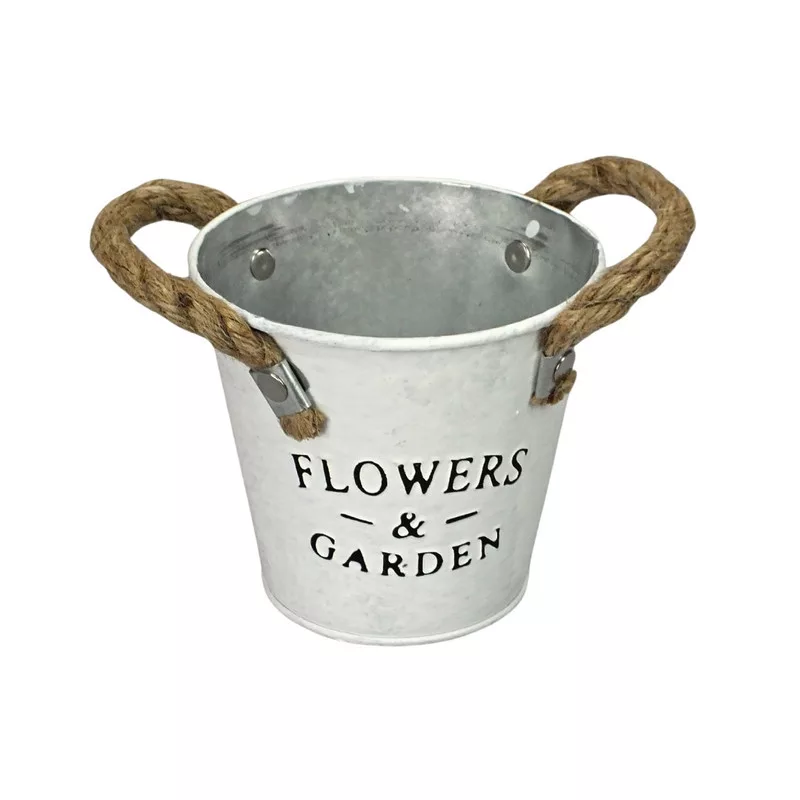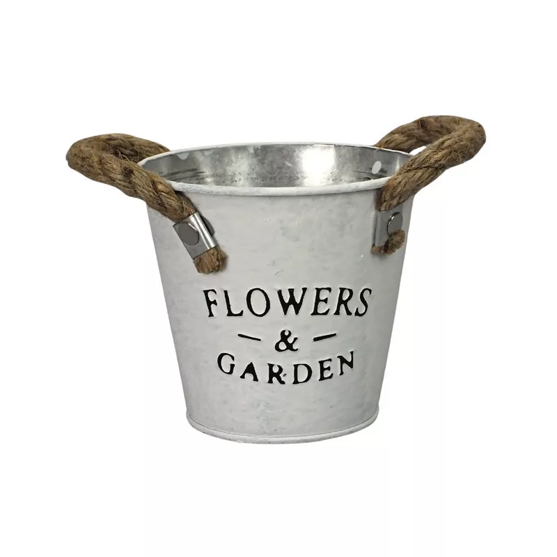 "Flowers & Garden" feliratos bádog kaspó, kötél fülekkel.