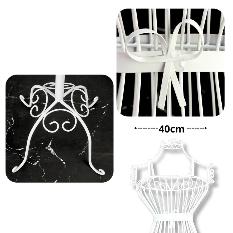 Ez a finom, romantikus hangulatú fehér fém próbababa letisztult eleganciájával bármely dekoráció tökéletes kiegészítője lehet. Könnyed, csipkeszerű kialakítása miatt kiváló választás ünnepi alkalmakra, fotózásokhoz, kirakatokba vagy kreatív enteriőrökbe. A fehér szín időtlen és sokoldalú, így könnyedén összeilleszthető virágokkal, szalagokkal, textíliákkal és fényekkel. Akár modern, akár vintage stílusban gondolkodsz.