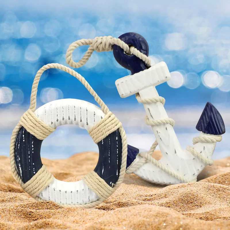 Fából készített, a nyár hangulatát megidéző dekorációk. A fehér-matrózkék színek felébresztik a díszben szunnyadó eleganciát és stílusos megjelenést kölcsönöz a kompozícióidnak. A horgony és a mentőöv is vastag kötéllel vannak ellátva, illetve akasztóval is rendelkeznek így könnyedén használhatod akár fali- vagy ajtódíszként is. Kreatív alkotók számára kiváló választás, a tengerpart szerelmesei számára pedig egyenesen kihagyhatatlan.