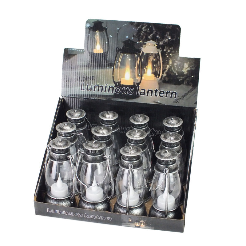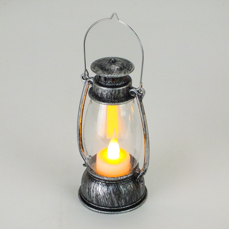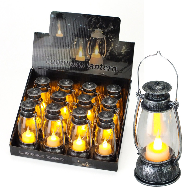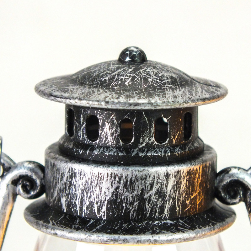 Koptatott fém hatású, műanyag világító elemes lámpás. A lámpás használható önmagában, vagy koszorúkra és díszekre, kegyeleti dekorációkhoz. Akasztó füllel ellátott, és teljesen ellenáll az időjárási viszontagságoknak. A lámpásokban az elem tartozékként megtalálható.