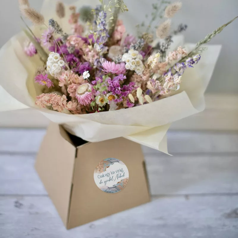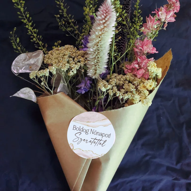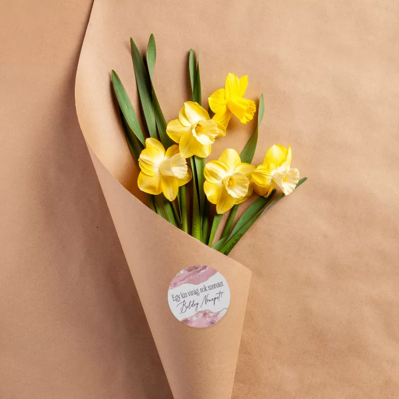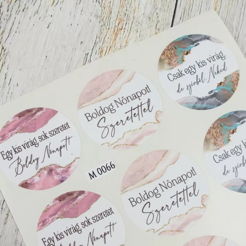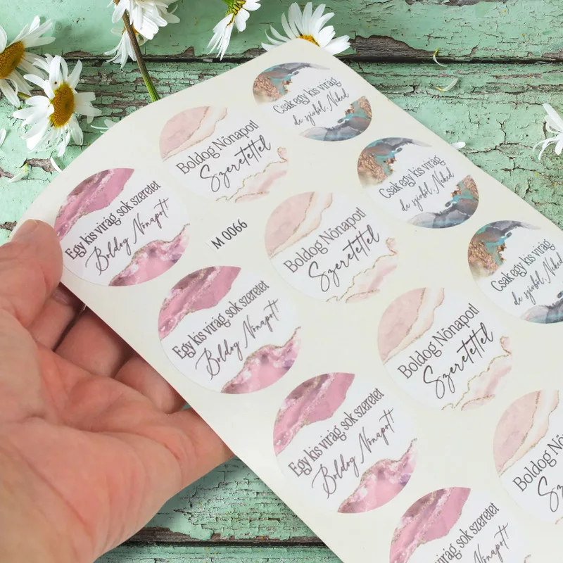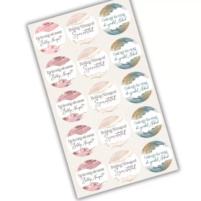 Ez a saját gyártású nőnapi márványos matrica letisztult mintázatával elegáns megjelenést biztosít. A finom márványos grafika visszafogottan hangsúlyozza a nőnap alkalmi jellegét, miközben könnyedén illeszkedik különböző csomagolási és dekorációs stílusokhoz. A lapon elhelyezett 15 darab matrica praktikus megoldást kínál ajándékcsomagok, virágcsokrok vagy kisebb dekorációk kiegészítésére. Ideális választás, ha egységes, igényes részletekkel szeretnéd teljessé tenni a nőnapi megjelenést.