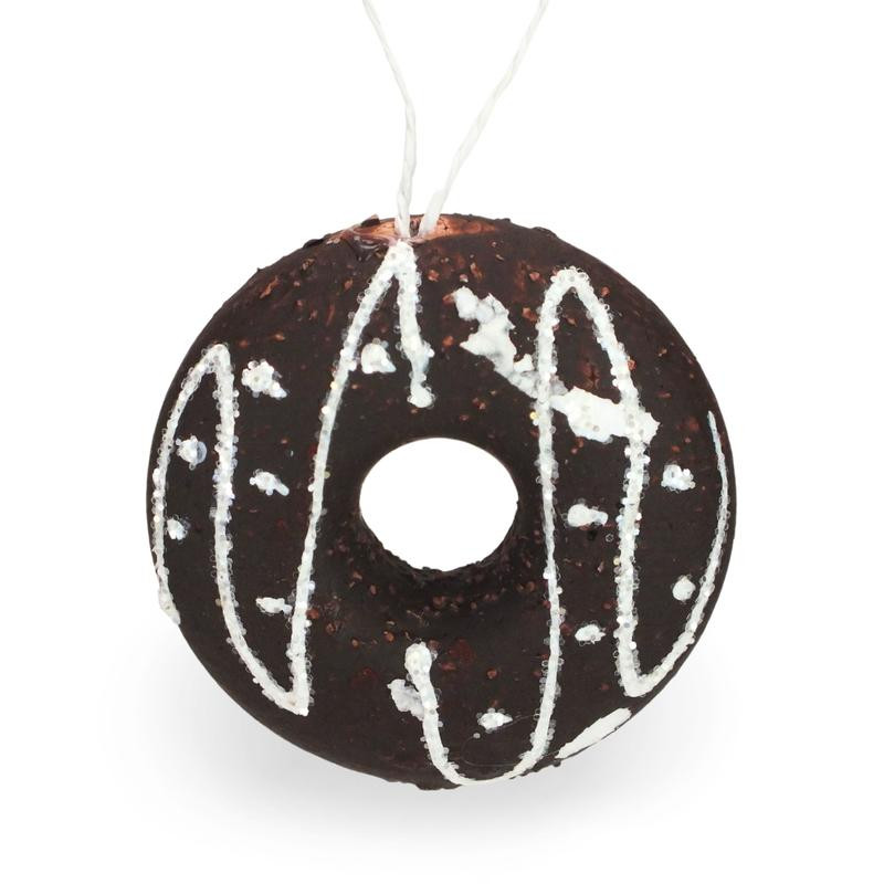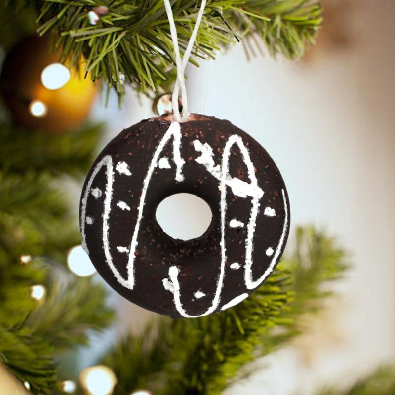 Fánk alakú csokis mézeskalács karácsonyfadísz, akasztóval ellátva.