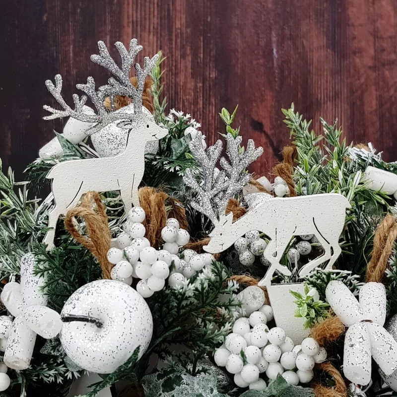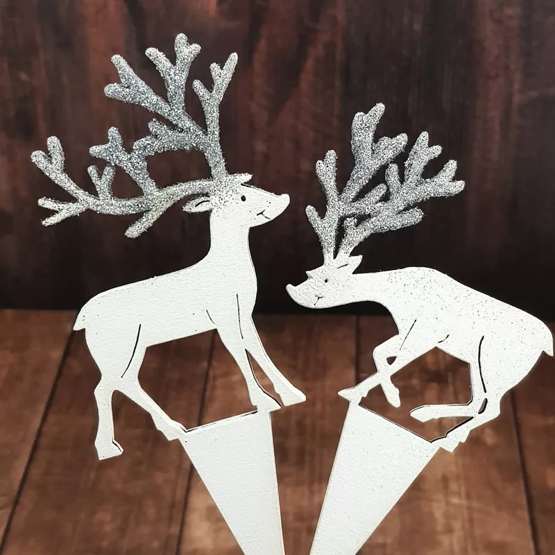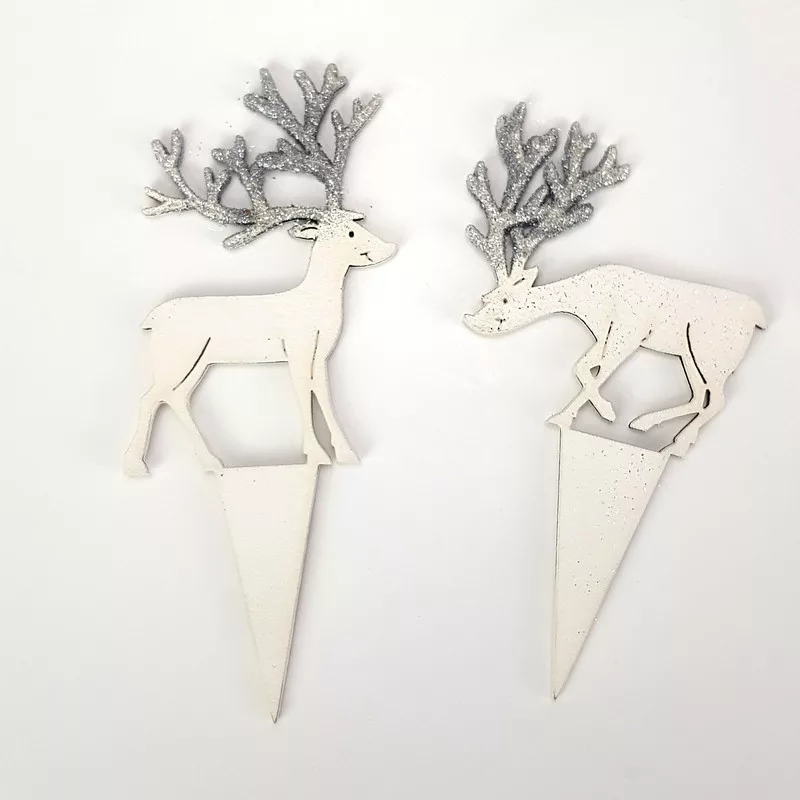 Natúr fából készített, fehérre festett szarvasok, ezüst színű csillámos szarvakkal. A beszúrós talp megkönnyíti a dekorációba való beillesztést és segít megúszni a ragasztással járó nehézségeket. Így utólag is megváltoztathatjuk a szarvasok helyét a készítményben. Fantasztikus karácsonyi dekoráció, ami nem köszön vissza minden üzletben vagy otthoni dekorációban.