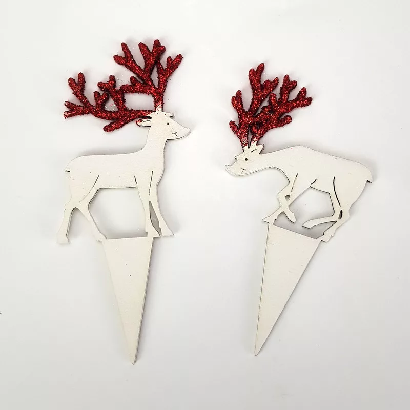 Natúr fából készített, fehérre festett szarvasok, piros színű csillámos szarvakkal. A beszúrós talp megkönnyíti a dekorációba való beillesztést és segít megúszni a ragasztással járó nehézségeket. Így utólag is megváltoztathatjuk a szarvasok helyét a készítményben. Fantasztikus karácsonyi dekoráció, ami nem köszön vissza minden üzletben vagy otthoni dekorációban.