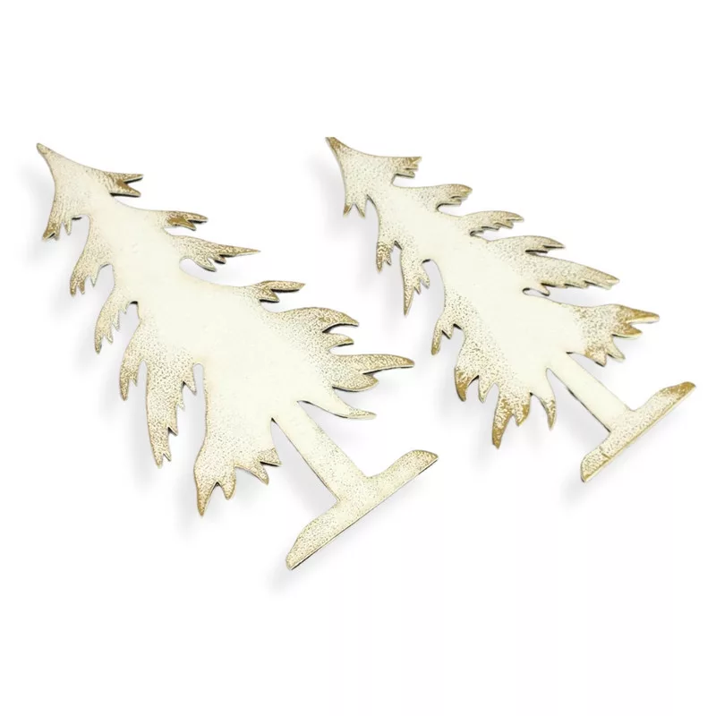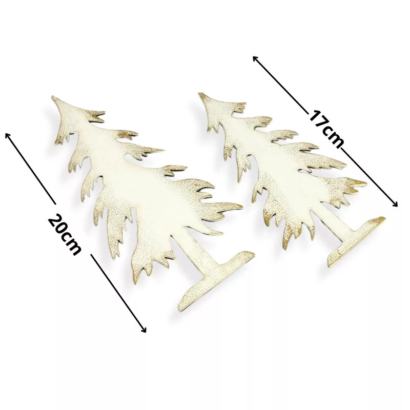 Natúr fából lézervágott fenyő formák, fehérre festve és arany színnel díszítve. Jól mutat egyedi karácsonyi készítményekben, otthoni dekorációkban és üzletek bemutatóiban, kirakatokban.