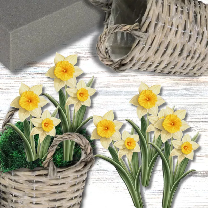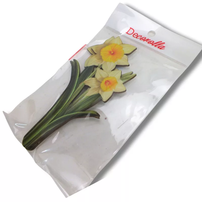 Ez a nyomtatott dekorkarton csomag két darab nárcisz virágot ábrázoló dekorációt tartalmaz. Szép kiegészítője lehet tavaszi és húsvéti koszorúknak, asztali díszeknek vagy egyéb kreatív összeállításoknak. Könnyű anyaga miatt egyszerűen rögzíthető, és jól kombinálható más virágos, természetes hangulatú dekorációs elemekkel.