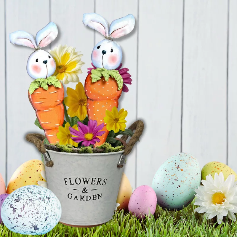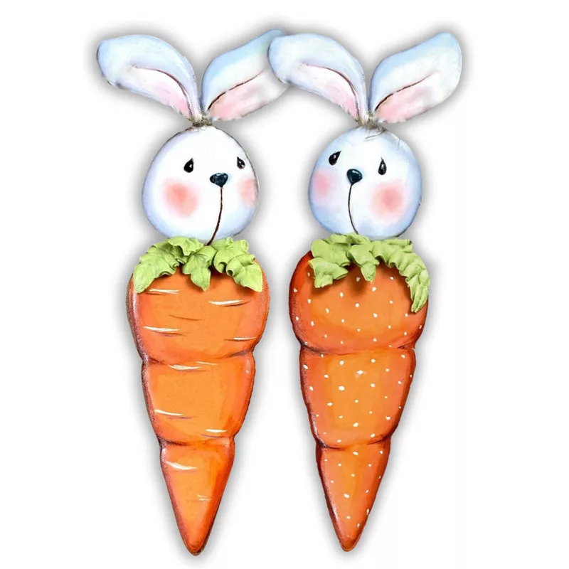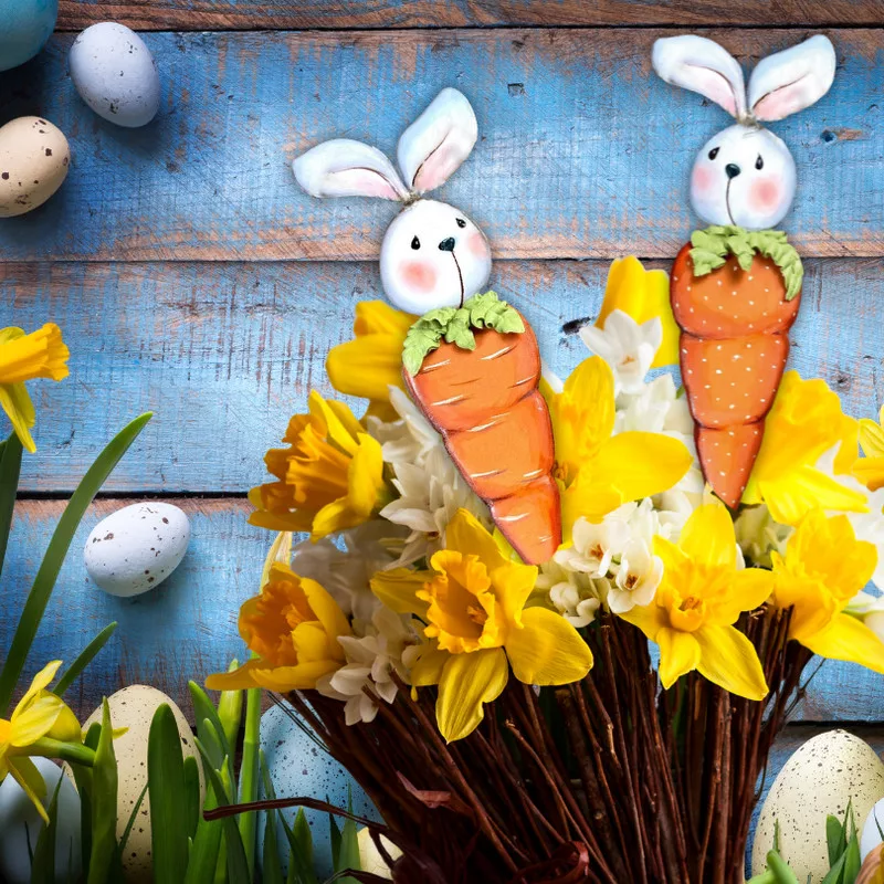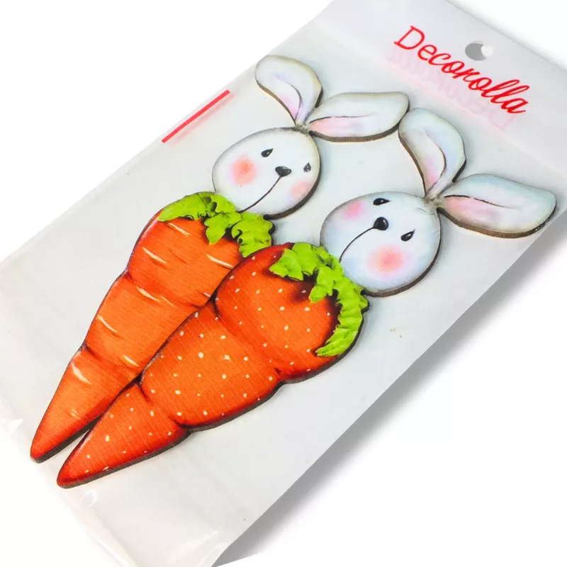 Ez a nyomtatott dekorkarton csomag két darab nyuszi-répa mintájú dekorációt tartalmaz. Saját gyártású termék, amely tökéletes választás húsvéti és tavaszi dekorációkhoz, koszorúkhoz, asztaldíszekhez vagy kreatív összeállításokhoz. Könnyű anyaga miatt egyszerűen rögzíthető, és jól kombinálható más nyuszis, tojásos vagy virágos dekorációs elemekkel.