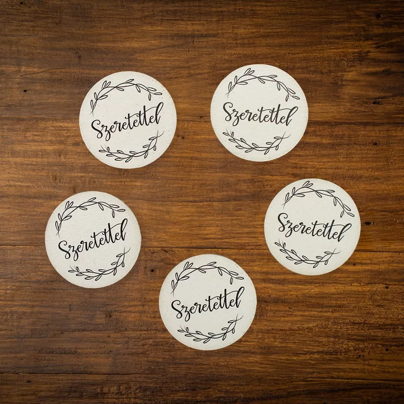 Különleges nyomtatási eljárással készített, lézervágott natúr fa táblák. Előnyös a kézzel alkotott készítmények kihangsúlyozásához, így megjelenésével kiemeli azt a hétköznapi díszek közül.