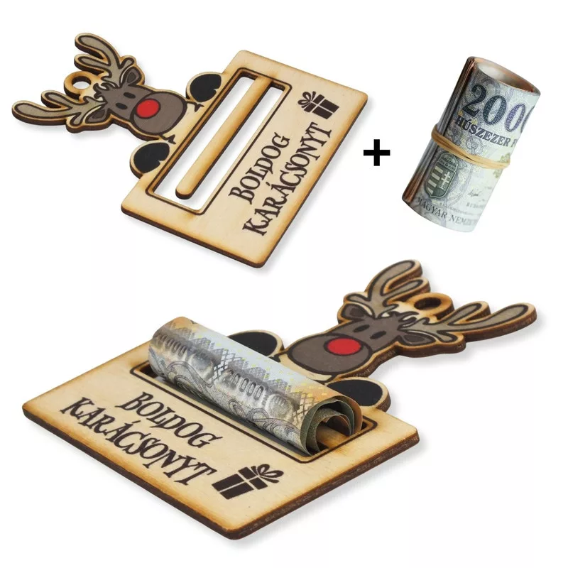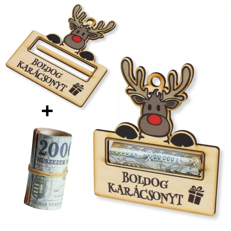 Lepd meg szeretteidet stílusosan ezzel az egyedi, karácsonyi hangulatú fa pénztartóval! A vidám rénszarvas motívum és a „Boldog Karácsonyt” felirat igazán különlegessé teszi az ajándékozást. Nem kell többé egyszerű borítékba rejteni a pénzt. Ezzel a kreatív tartóval igazán személyes és emlékezetes lesz a meglepetés.
