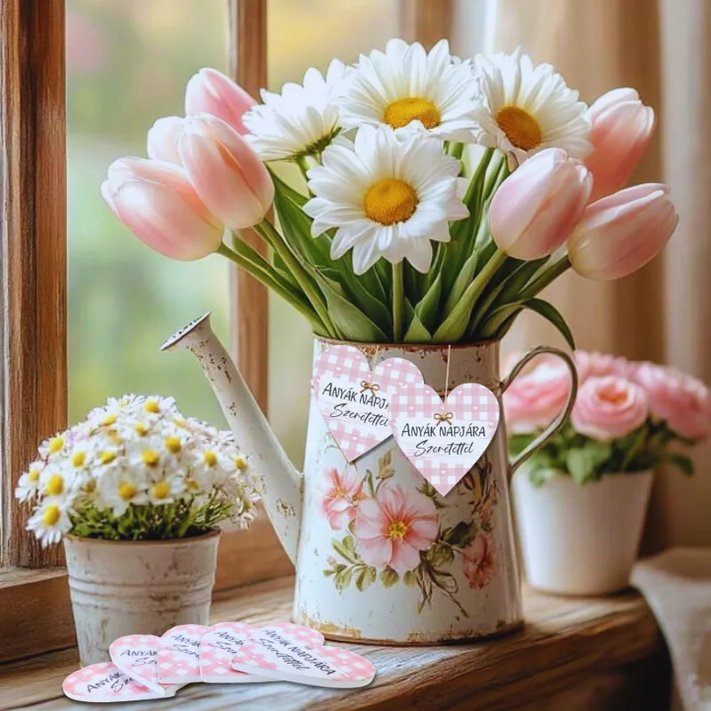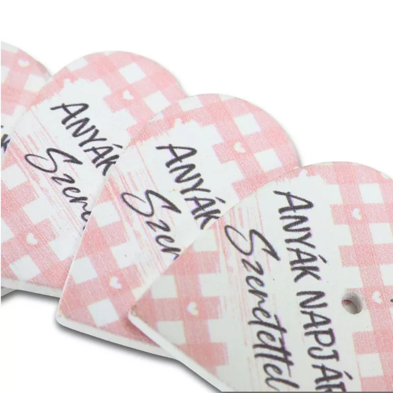 Ez a saját gyártású nyomtatott fa tábla anyák napjára készült, finom rózsaszín színvilágával letisztult és kedves megjelenést kínál. A 4 cm-es méret diszkrét kiegészítővé teszi, amely jól illeszkedik ajándékcsomagokhoz, virágok mellé vagy kisebb dekorációs összeállításokhoz. Az 5 darabos kiszerelés praktikus választás, ha több ajándékot szeretnél egységes stílusban kiegészíteni. A fa alap természetes hatást biztosít, miközben a nyomtatott felirat visszafogottan hangsúlyozza az anyák napja üzenetét.