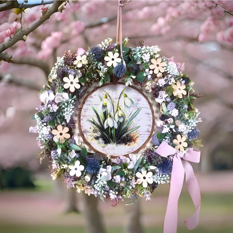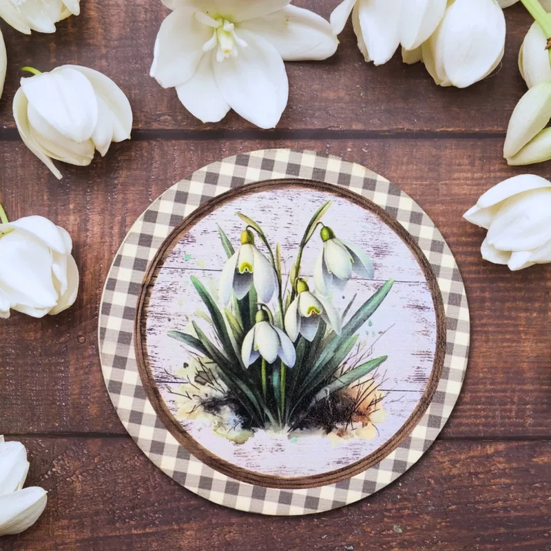 Nyomtatott fa tábla - Hóvirágok retró koszorú közép 11,8cm