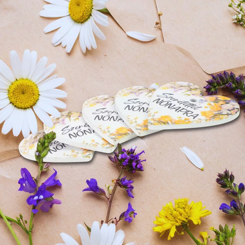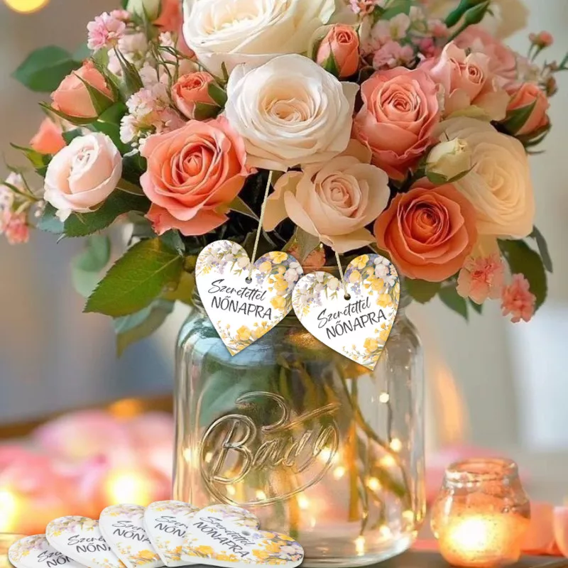 Ez a nyomtatott fa tábla nőnapra készült, finom virágos mintájával letisztult és ünnepi megjelenést biztosít. A 4 cm-es méret ideális ajándékcsomagok, virágcsokrok vagy kisebb dekorációk kiegészítésére. Az 5 darabos kiszerelés lehetőséget ad arra, hogy több ajándékot egységes stílusban díszíts. A fa alap természetes hatást kölcsönöz, míg a virágos grafika visszafogottan hangsúlyozza a nőnap üzenetét.
