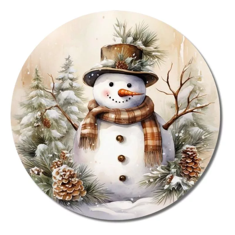 Nyomtatott fa tábla koszorú közép - Mosolygós hóember 11,8cm