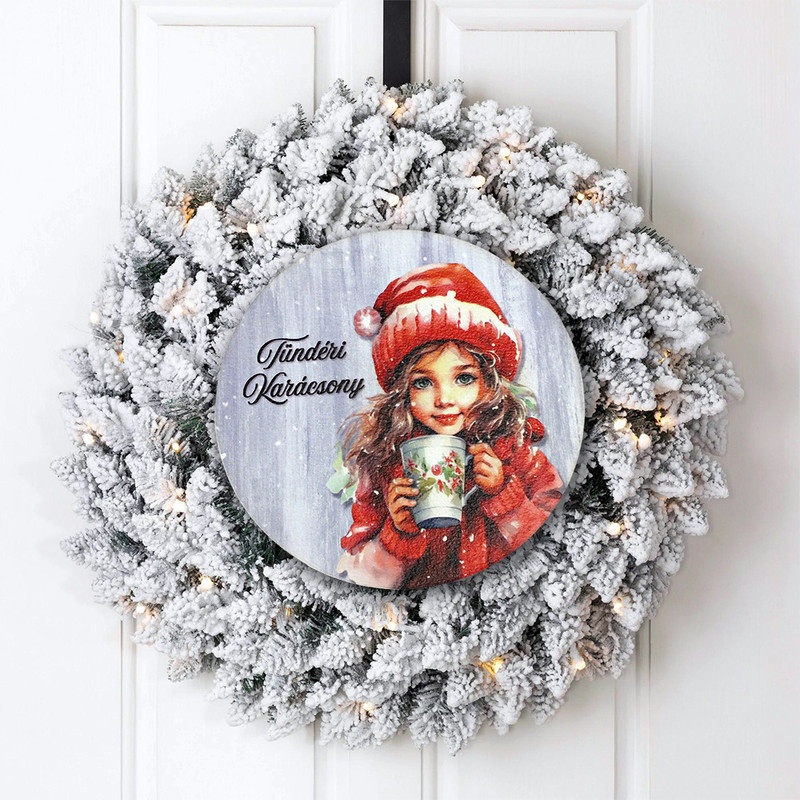 Nyomtatott fa tábla koszorú közép - Tündéri karácsony kislány 14,8cm