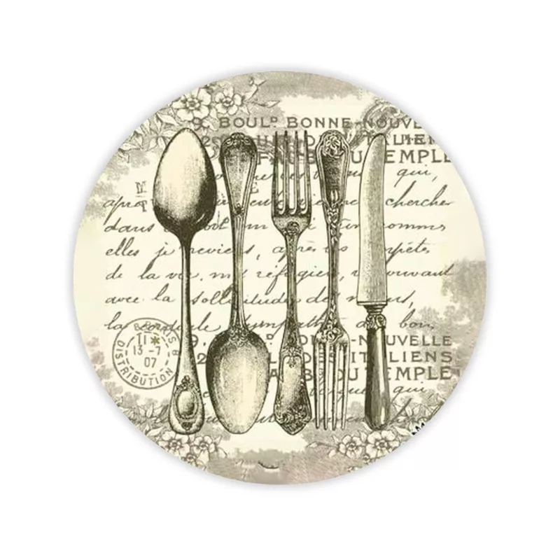 A vintage evőeszköz mintával készült nyomtatott fa tábla koszorú közép 11,8 cm-es méretben különleges, karakteres megjelenést ad a dekorációknak. Saját gyártású termék, amely egyedi eljárással, precíz lézervágással és nyomtatott felülettel készül. Ideális választás koszorúk középrészének, ajtódíszekhez vagy egyedi dekorációs kompozíciók hangsúlyos elemeként. A vintage stílusú grafika jól illeszkedik klasszikus, rusztikus vagy vidéki hangulatú dekorációkhoz. Ajánlott mindazok számára, akik a kézzel alkotott díszítéseiket egy egyedi, igényesen kidolgozott fa táblával szeretnék kiemelni, és eltérni a hétköznapi megoldásoktól.