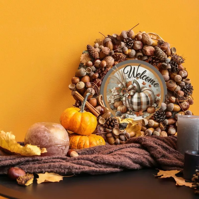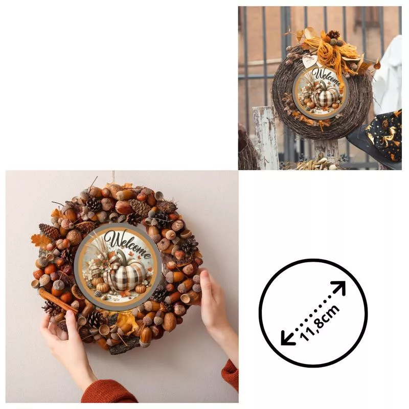 Nyomtatott fa tábla koszorú közép - Welcome kockás tökkel 11,8cm