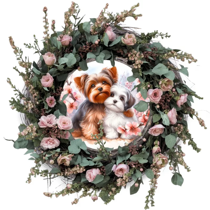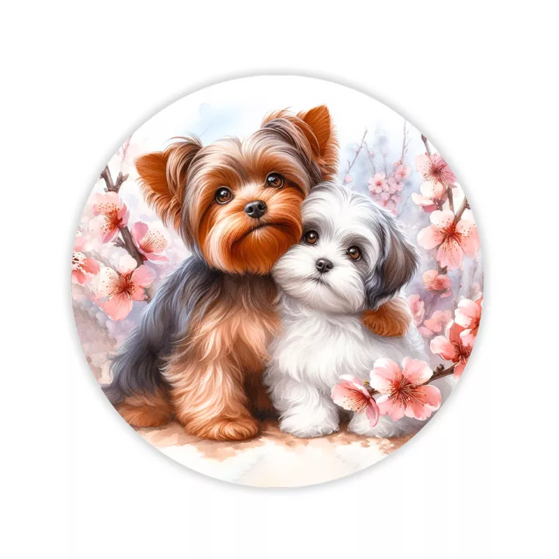 A Yorki kutyusos mintával készült nyomtatott fa tábla koszorú közép 11,8 cm-es méretben kedves és figyelemfelkeltő kiegészítője a dekorációknak. Saját gyártású termék, amely különleges eljárással, precíz lézervágással és nyomtatott felülettel készül. Kiválóan alkalmas koszorúk középrészének, ajtódíszekhez vagy egyedi dekorációs kompozíciók hangsúlyos elemeként. A részletgazdag Yorki kutyusos grafika barátságos, vidám megjelenést kölcsönöz. Ajánlott mindazok számára, akik a kézzel készített dekorációikat egy különleges, egyedi megjelenésű fa táblával szeretnék kiemelni, és eltérni a megszokott, hétköznapi díszítésektől.
