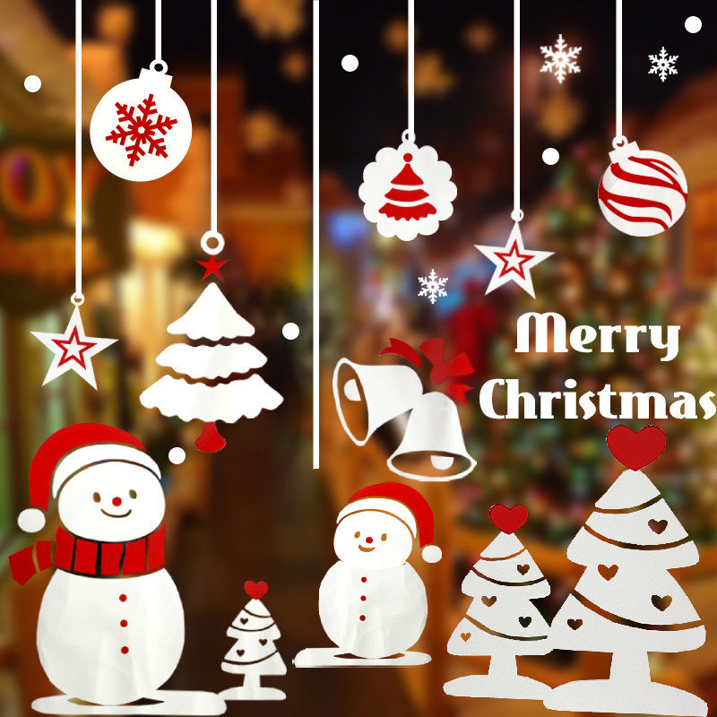 Merry Christmas felirat, 3db fenyő, 2db hóember és még sok más: karácsonyfadísz, hópehely, füzérek, csillagok és fehér pettyek.