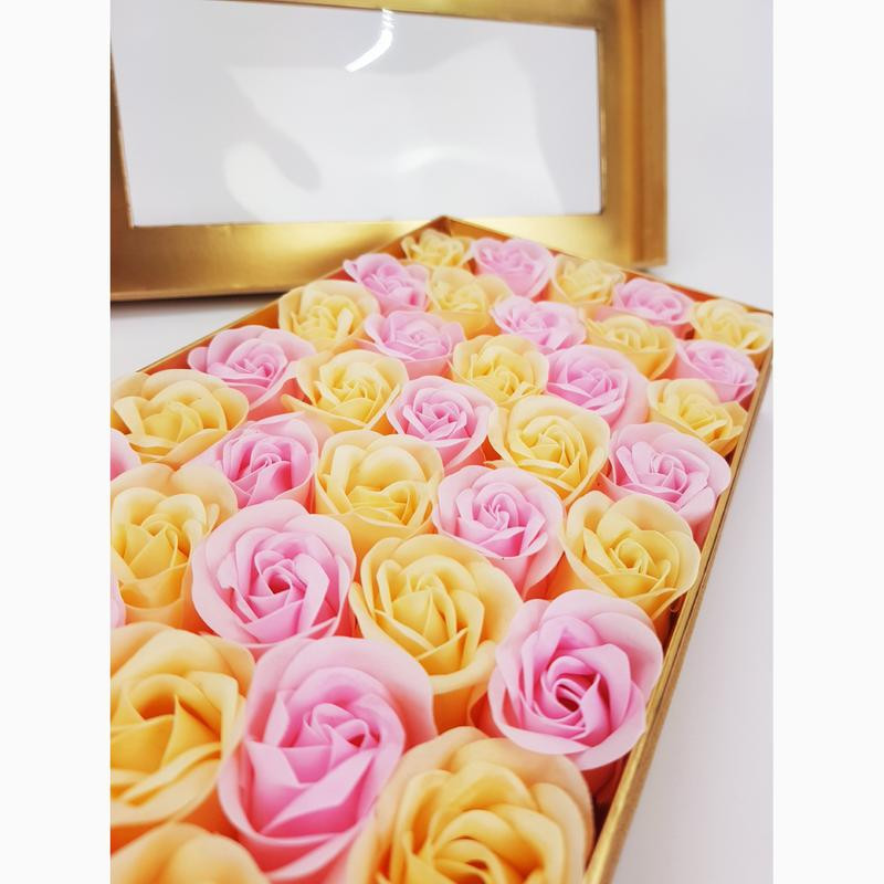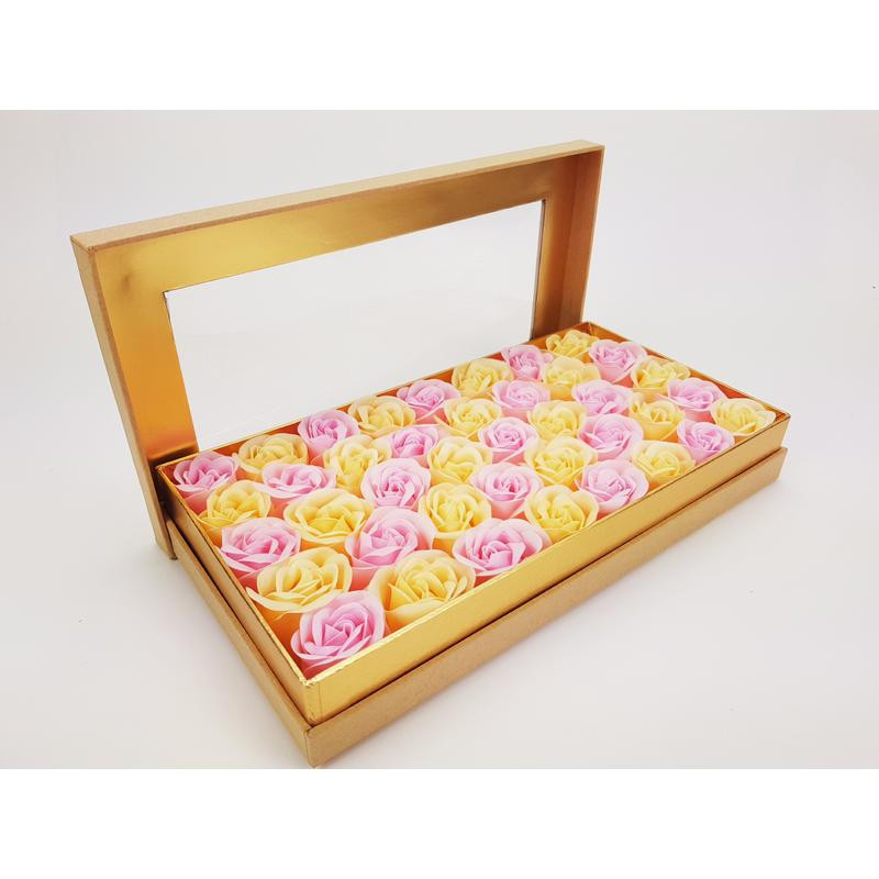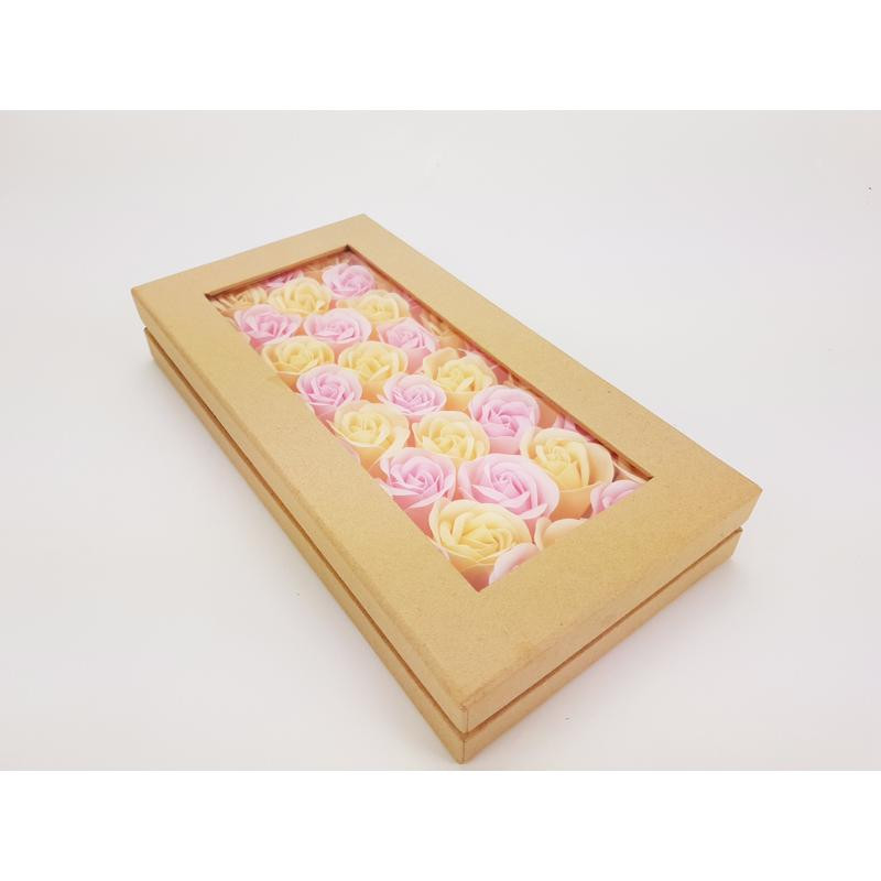 Natúr színű, átlátszó tetejű premium doboz, 20-20 darab krém & rózsaszín illatos szappanrózsával.
