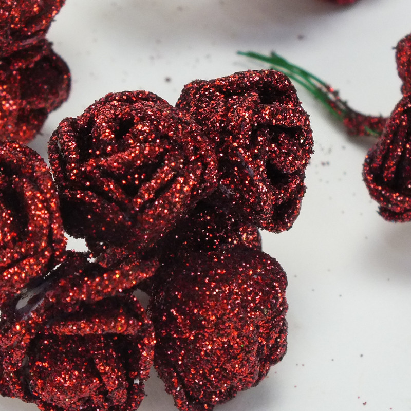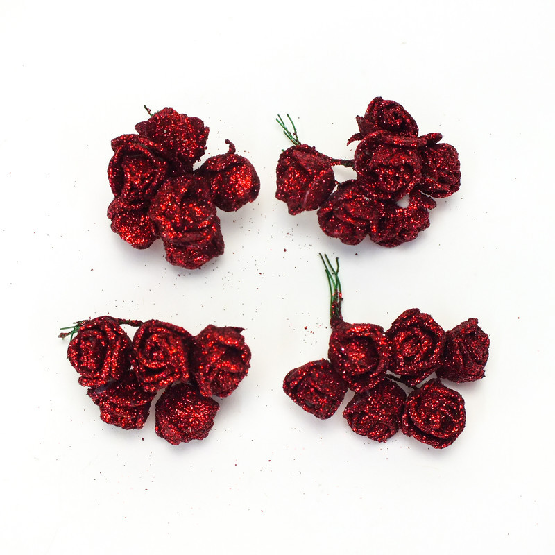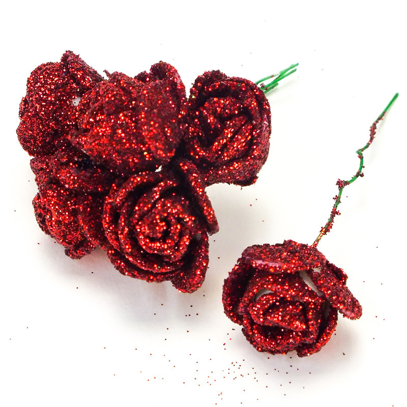 4x6 darabos csillámos rózsafej csokor. Tökéletes díszítő karácsonyi dekorációkhoz, egyedi készítményekhez és kreatív alkotásokhoz. Vékony fém szára lehetővé teszi a könnyű felhasználást.