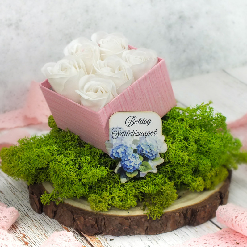 Rózsaszín doboz fehér szappanrózsával Boldog születésnapot kék