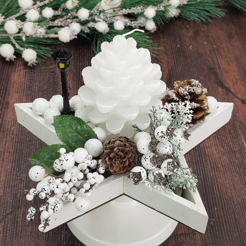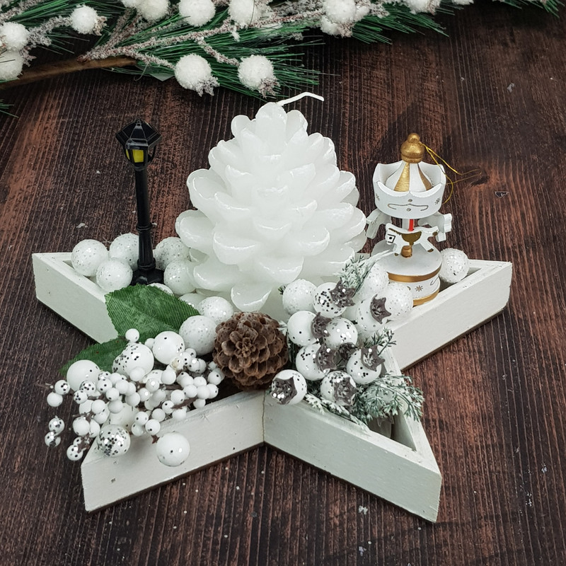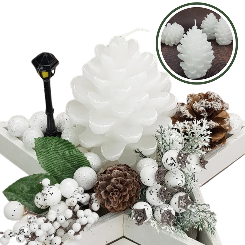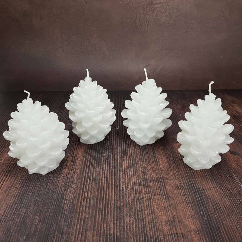4 darabos egyedi gyertya, amik önmagukban ékesen díszítik az otthonunkat és kiegészítik meglévő dekorációnkat. Toboz formájú fehér gyertyák, kiválóan beépíthetőek készítményekbe, adventi koszorúra.