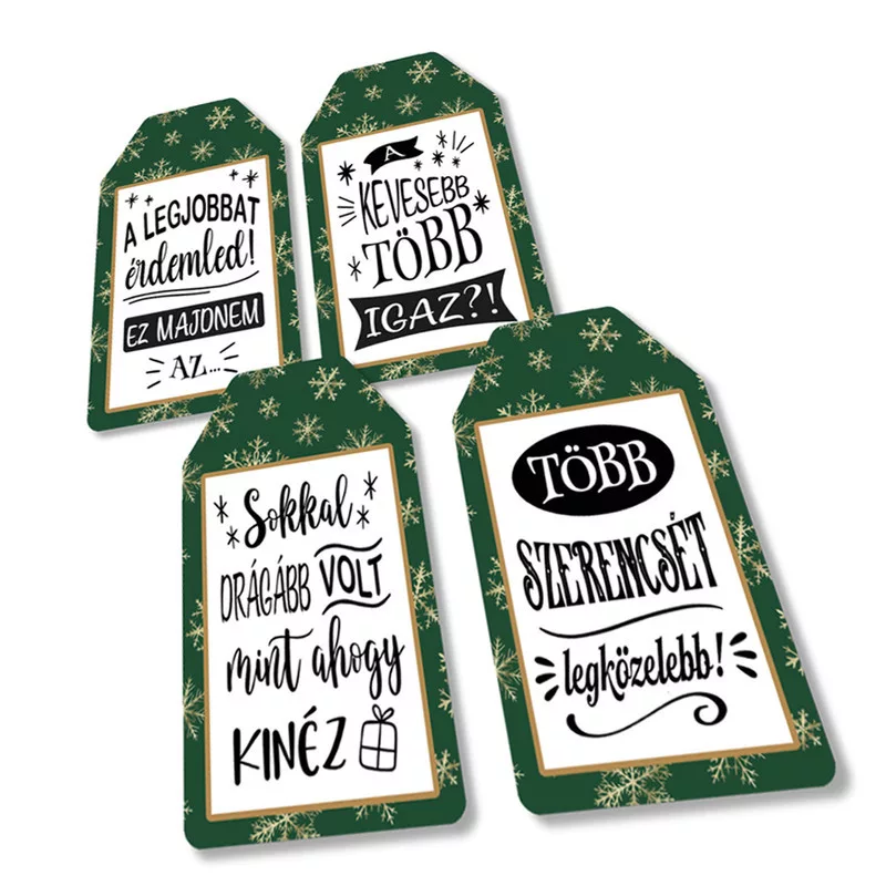 Ezek a vidám, saját gyártású nyomtatott dekorkartonból készült ajándékkísérő táblák garantáltan mosolyt csalnak az ünnepelt arcára. 4 különböző feliratú tábla egy csomagban.Könnyen rögzíthető (lyukkal ellátott a felfűzéshez). Ideális választás, ha egy kis játékosságot, kedvességet vagy csipetnyi iróniát vinnél az ajándékozásba!
