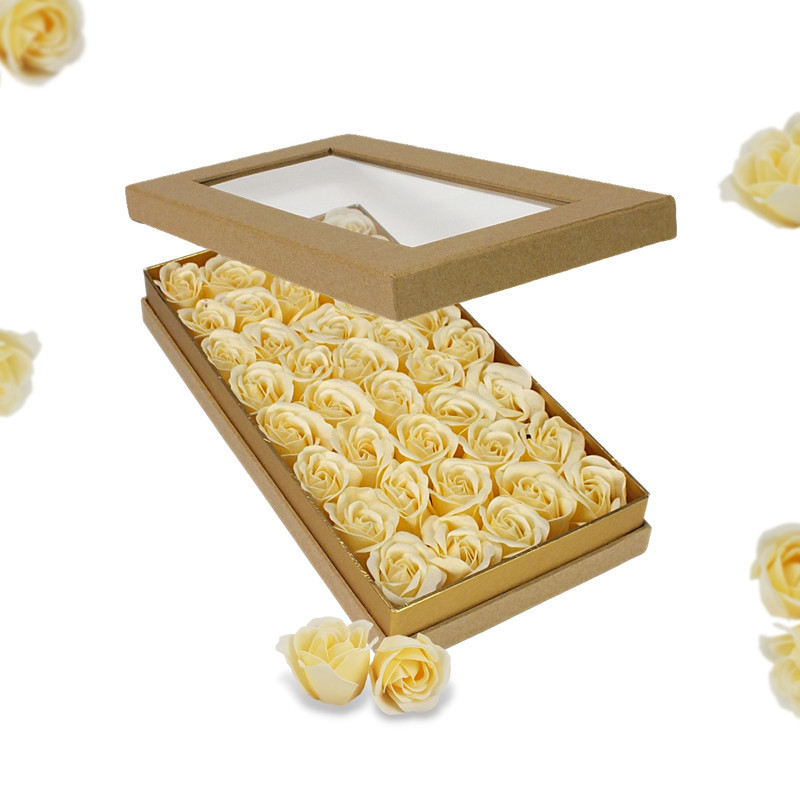 Párunknak, családtagoknak szóló ajándék doboz, anyák napjára vagy születésnapra de nem kell, hogy ünnep legyen, mert az év bármely napján kedveskedhetünk vele. Natúr színű, átlátszó tetejű prémium doboz, 40 darab krém színű, illatos szappanrózsával.